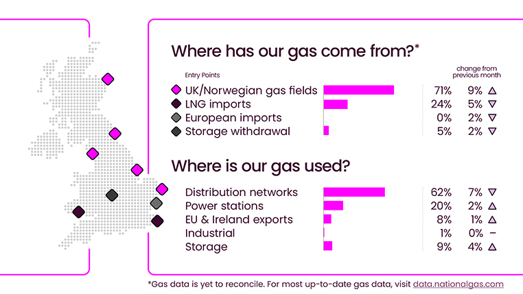 Most of our gas supply, 71%, came from UK and Norwegian gas fields, with Liquefied Natural Gas imports providing 24% and storage withdrawal 5% and imports the remaining 1%.
