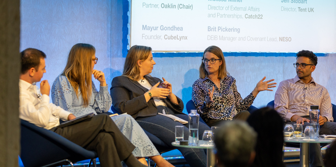 Pictured: Brit Pickering, DEIB Manager at NESO, speaking about reaching new talent pools at the Energy UK DEIB conference.