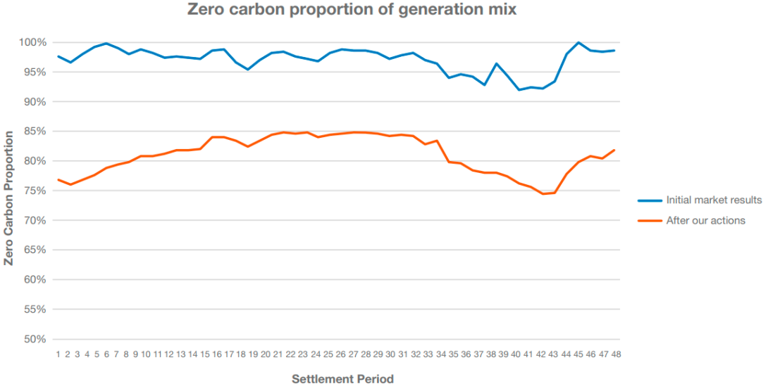 That’s why we’ve introduced two new metrics: the carbon intensity of our balancing actions, and the proportion of zero carbon power before and after we intervened.