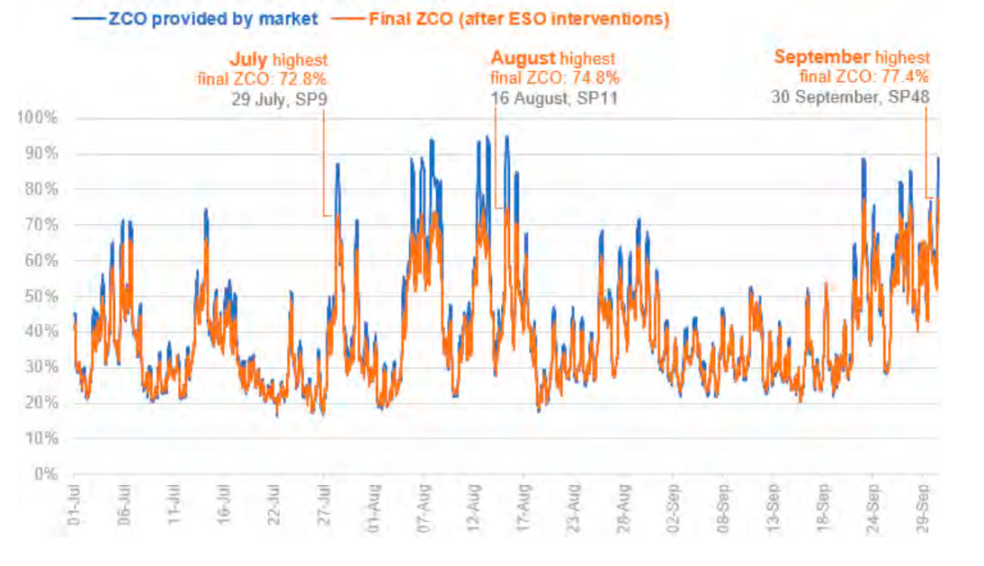 The graph below shows actions we took over summer to secure the system, which on occasion was being presented with over 90% zero carbon power from the market.