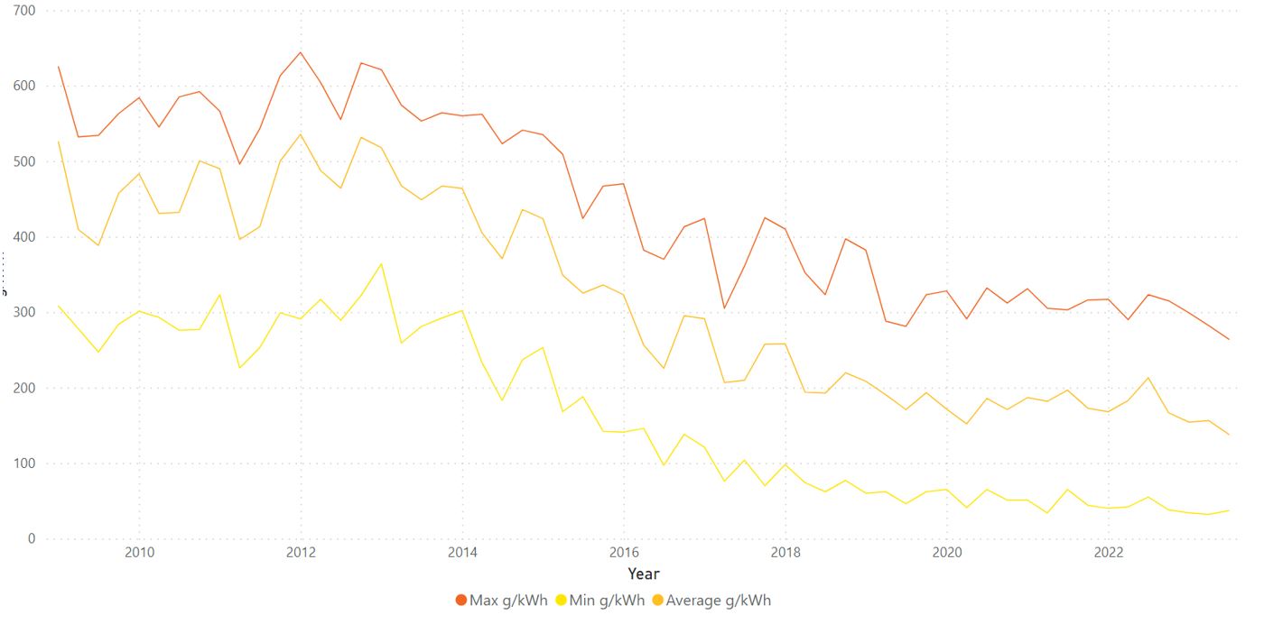 Great Britain is leading the way to a zero-carbon electricity system as we transition away from fossil fuels. In 2022, 95% of hours were less carbon intensive than the lowest carbon hour a decade earlier in 2012. So far, in 2023, we’ve only had one half-hour with a carbon intensity greater than 300g/kWh CO2e and in April this year, we had the lowest ever carbon intensity of electricity at 34g/kWh CO2e.