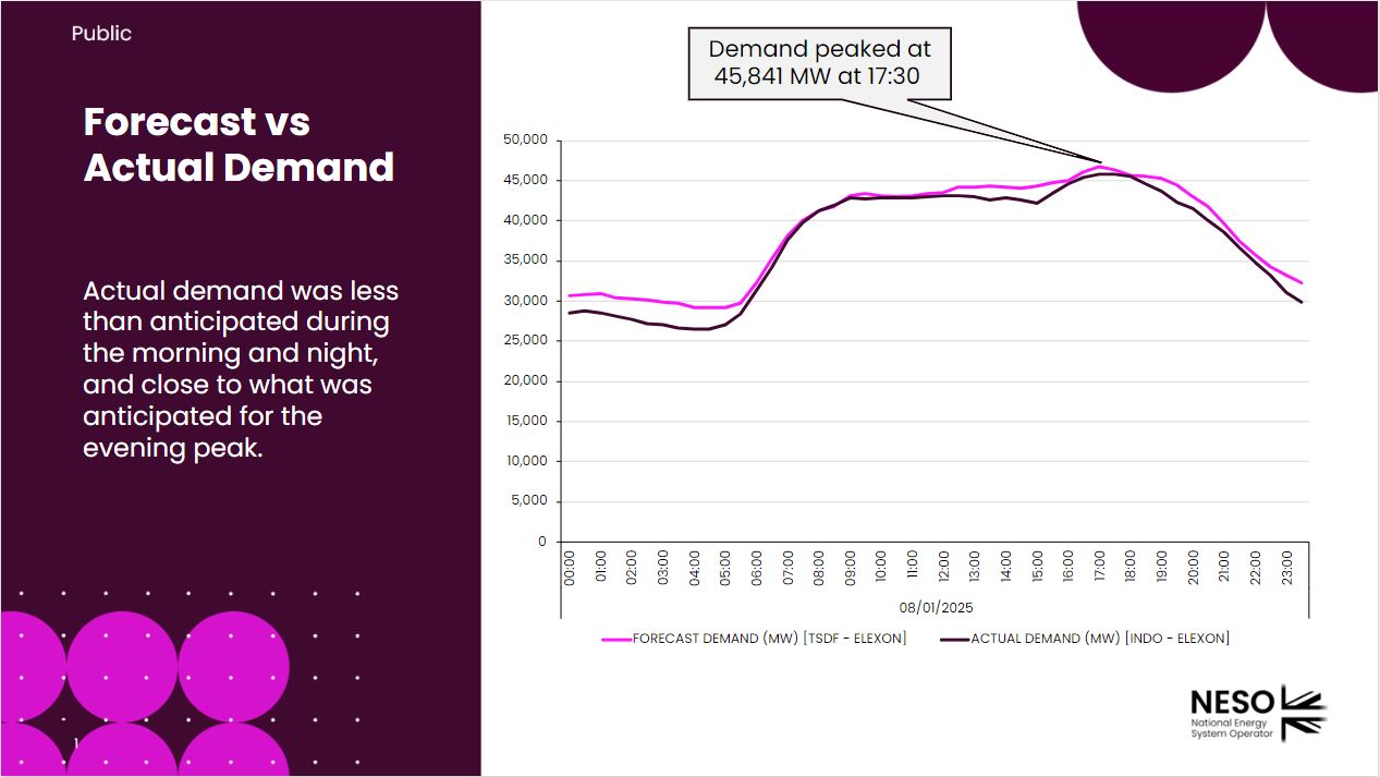The Demand Flexibility Service auction was activated at 09:00 on 8 January; the auction results secured 92MW – 184MW of demand turn down between 16:00 and 19:00. This service, facilitated by energy suppliers and aggregators, pays customers to shift their energy usage outside of a particular time window to lower the level of peak demand.