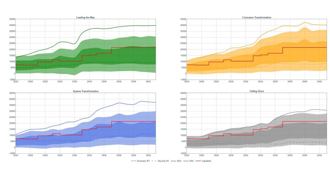 The capability line (in red) is based on the recommendations from the Beyond 2030 optimal path which uses the 2023 FES and ETYS data as inputs. The 50%, 90%, Economy RT and Security RT lines are based on FES 2024. The ETYS and NOA methodologies for this boundary are different and can result in different transfer capabilities.