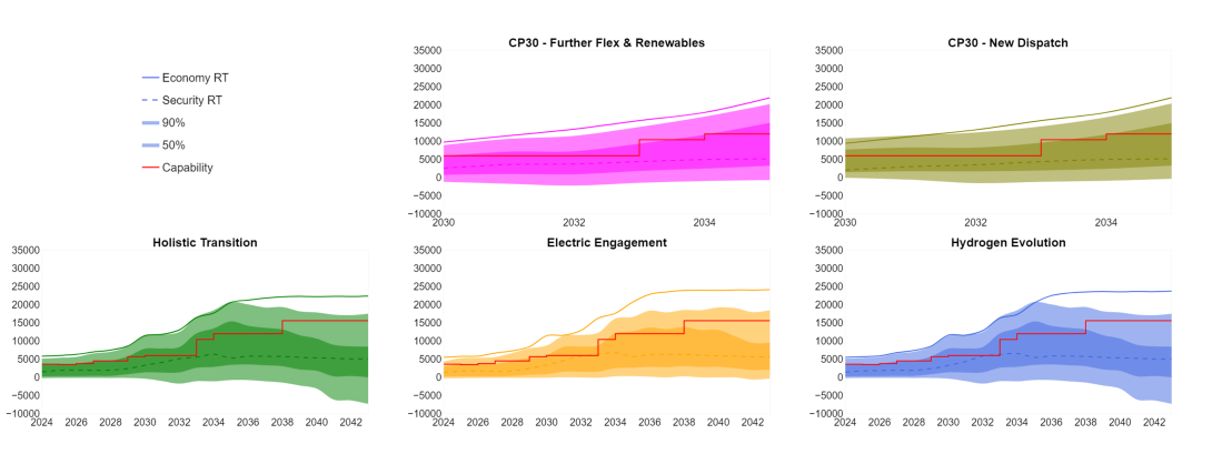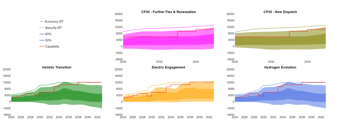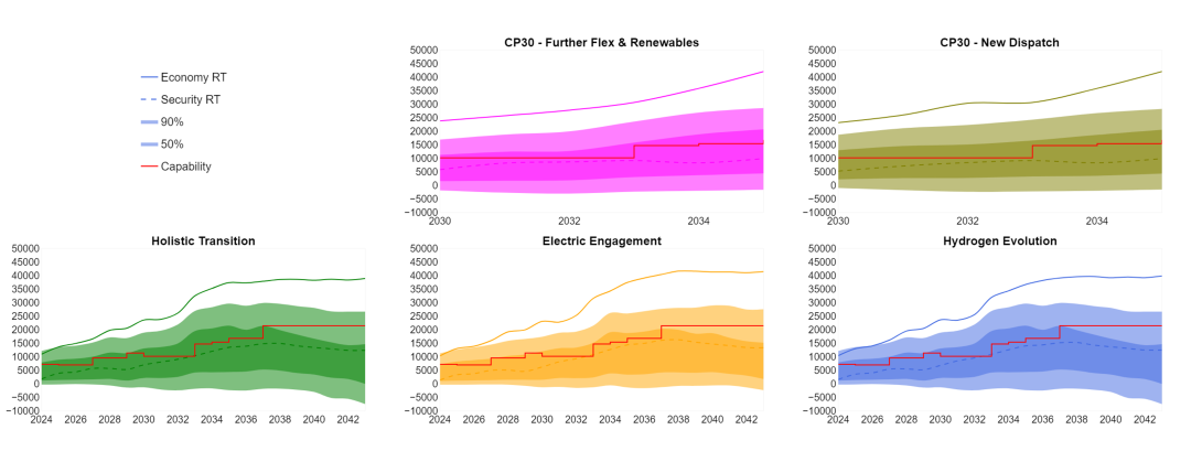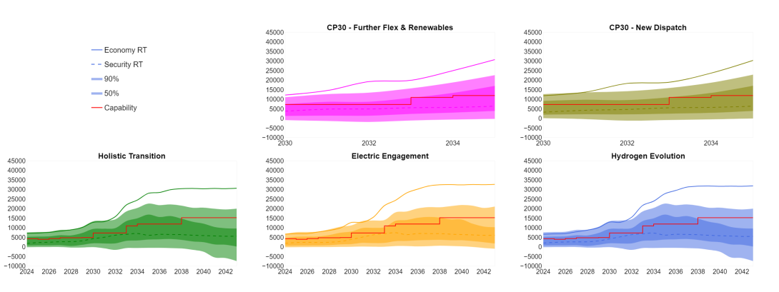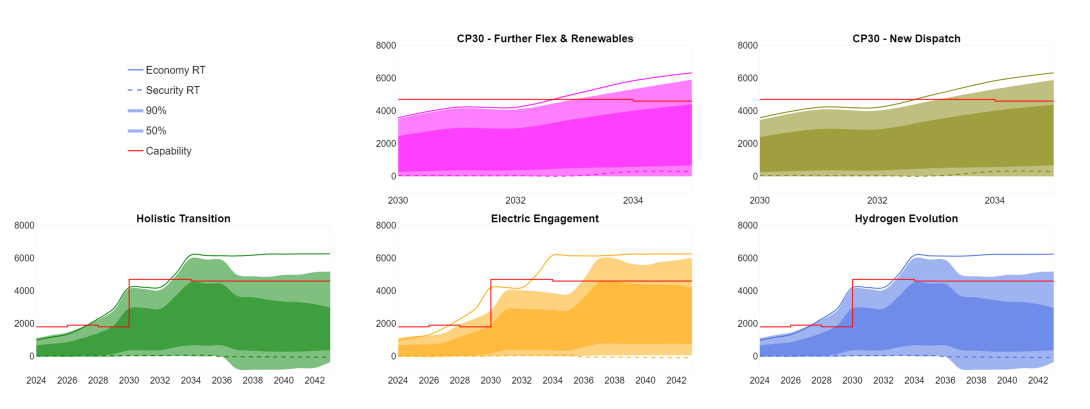 The capability line (in red) is based on the recommendations from the Beyond 2030 optimal path which uses the 2023 FES and ETYS data as inputs. The 50%, 90%, Economy RT and Security RT lines are based on FES 2024 and Clean Power 2030 pathways. The ETYS and NOA methodologies for this boundary are different and can result in different transfer capabilities.
