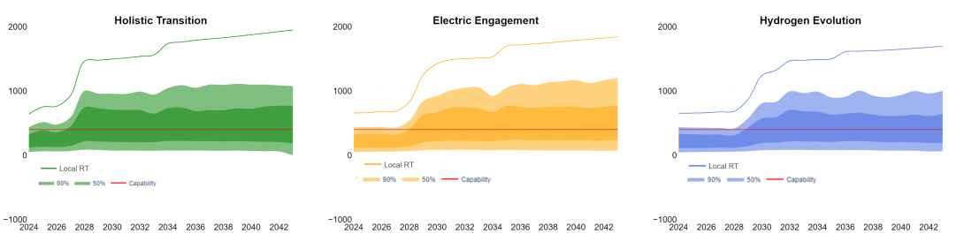 Beyond 2035, we see a decrease in expected transfers in the Holistic Transition and Hydrogen Evolution pathways. This is due to increasing demand in the north of Scotland whilst generation capacity remains relatively flat post-2035.