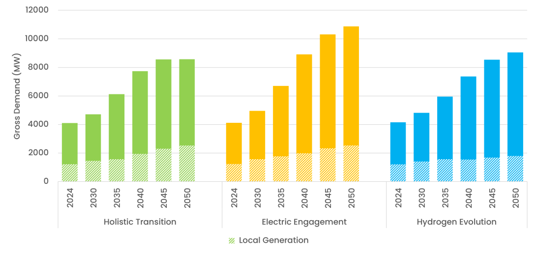 Scotland’s current winter peak gross demand is just over 4 GW and remains below 5GW in 2030 across all FES pathways. The generation capacity in Scotland today is just under 20 GW, this is set to more than double - rising to approximately 45 GW in the Holistic Transition pathway by 2030. Across all three FES pathways, the generation capacity of fossil fuel in Scotland reaches zero between 2035 - 2040.