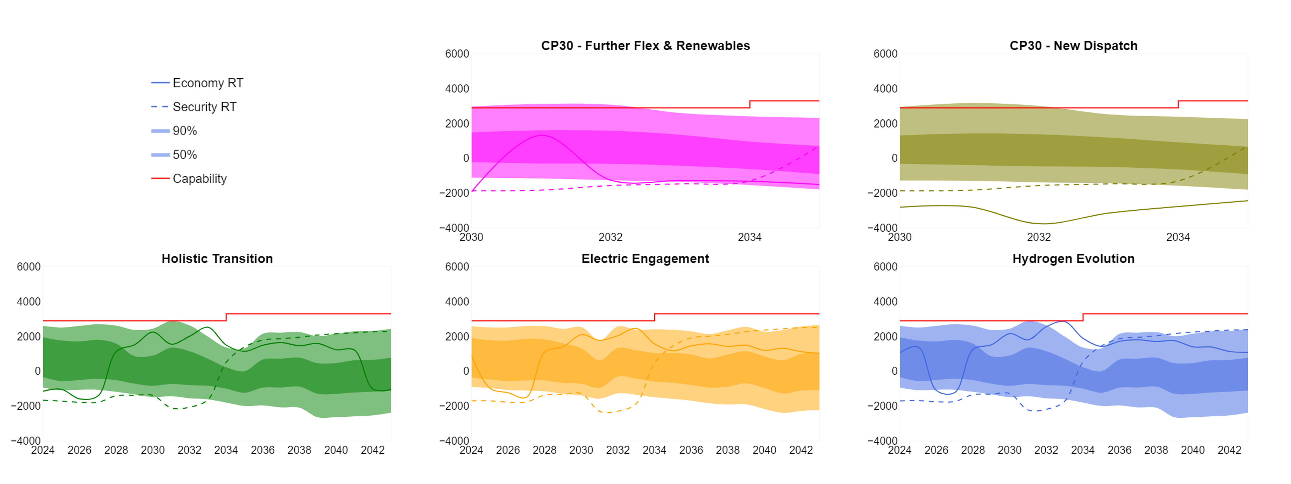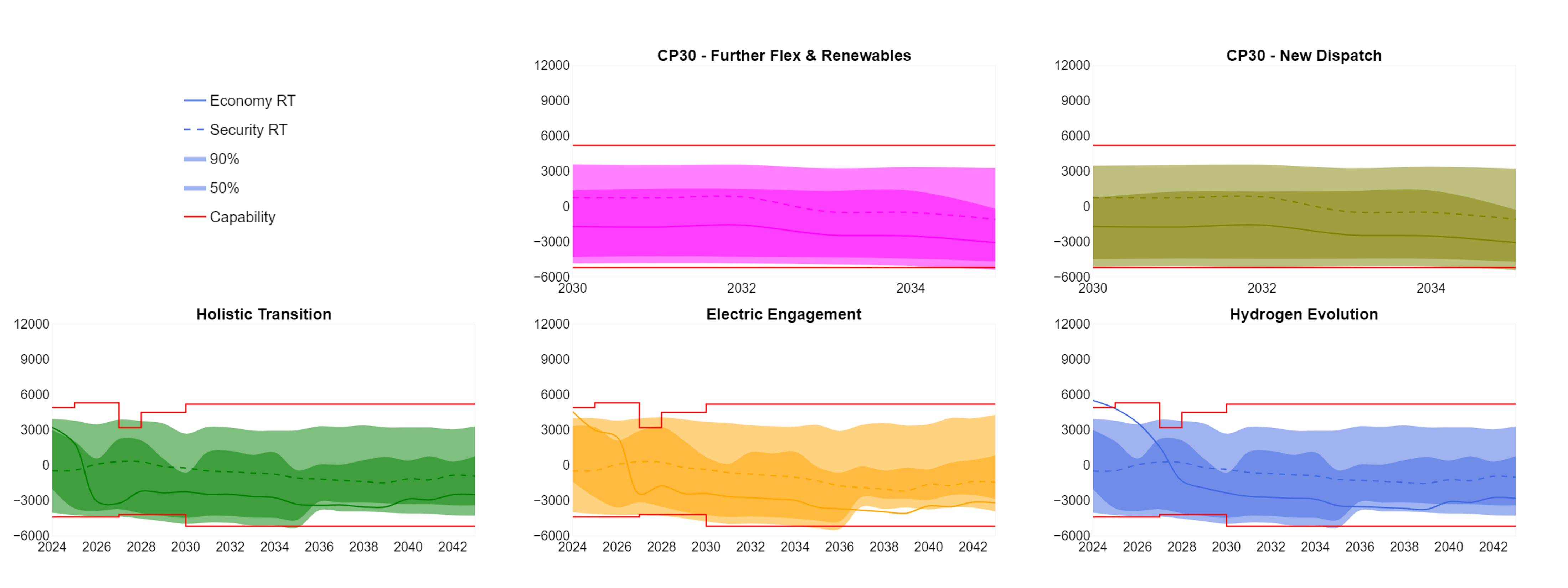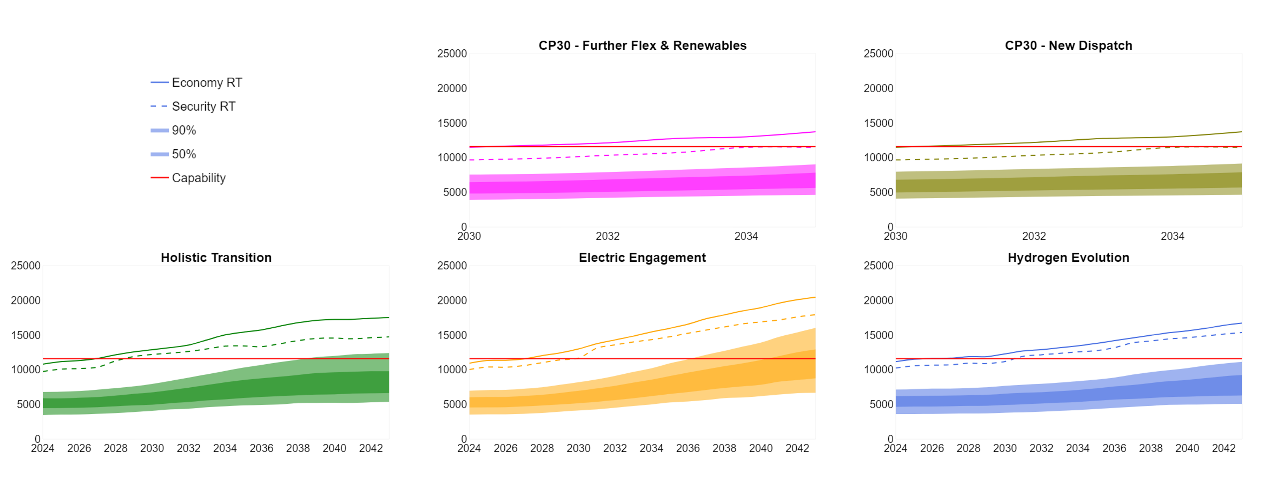 The capability line (in red) is based on the recommendations from the Beyond 2030 optimal path which uses the 2023 FES and ETYS data as inputs. The 50%, 90%, Economy RT and Security RT lines are based on FES 2024 and Clean Power 2030 pathways. The ETYS and NOA methodologies for this boundary are different and can result in different transfer capabilities.