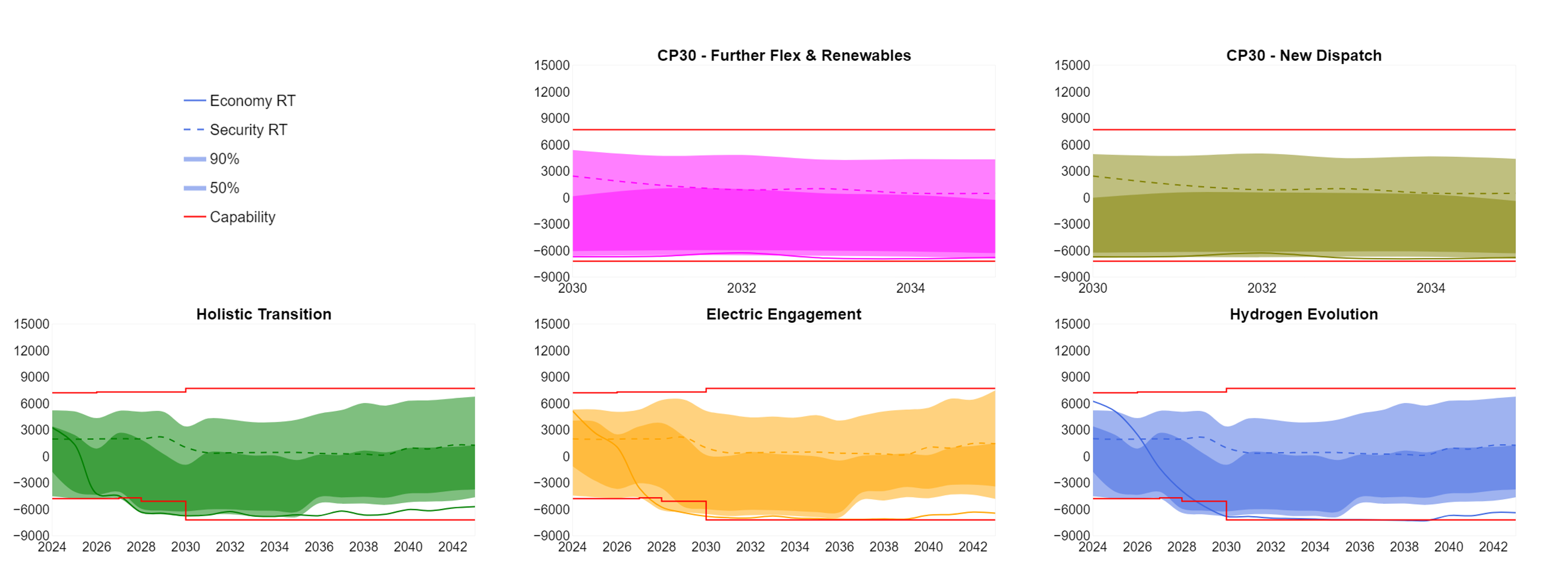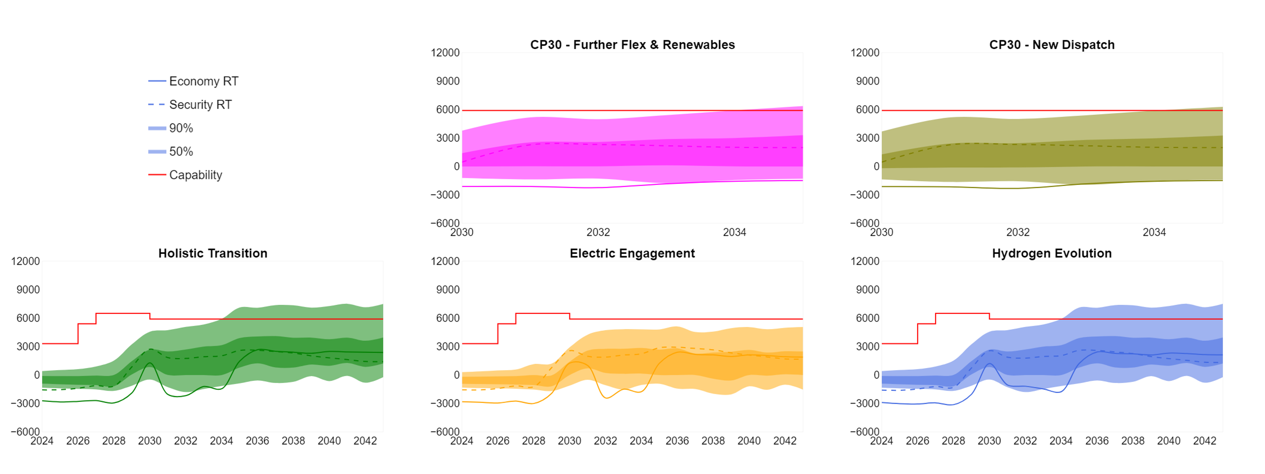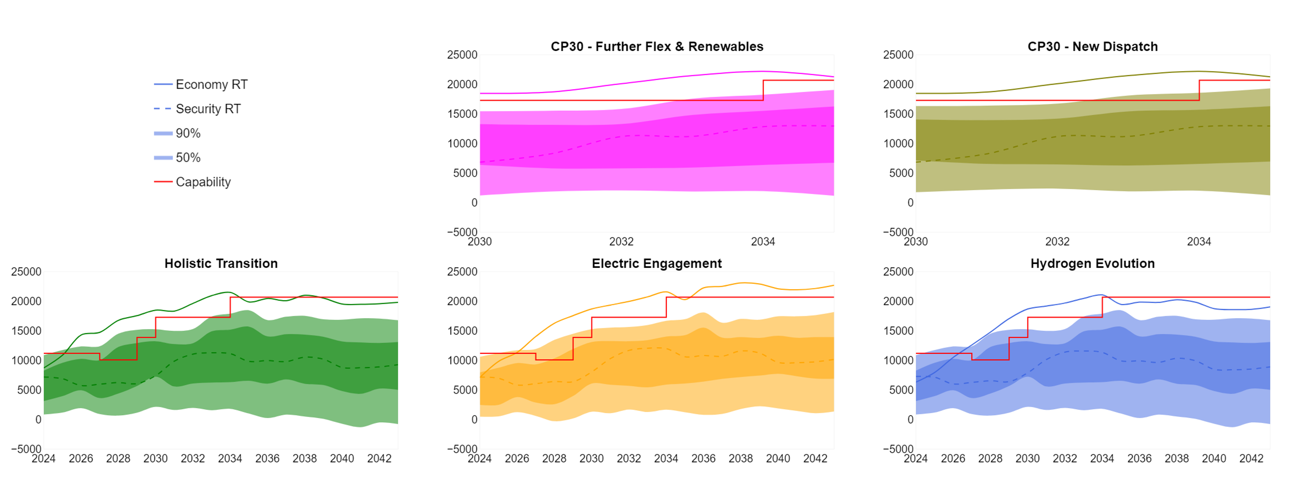The capability line (in red) is based on the recommendations from the Beyond 2030 optimal path which uses the 2023 FES and ETYS data as inputs. The 50%, 90%, Economy RT and Security RT lines are based on FES 2024 and Clean Power 2030 pathways. The ETYS and NOA methodologies for this boundary are different and can result in different transfer capabilities.
